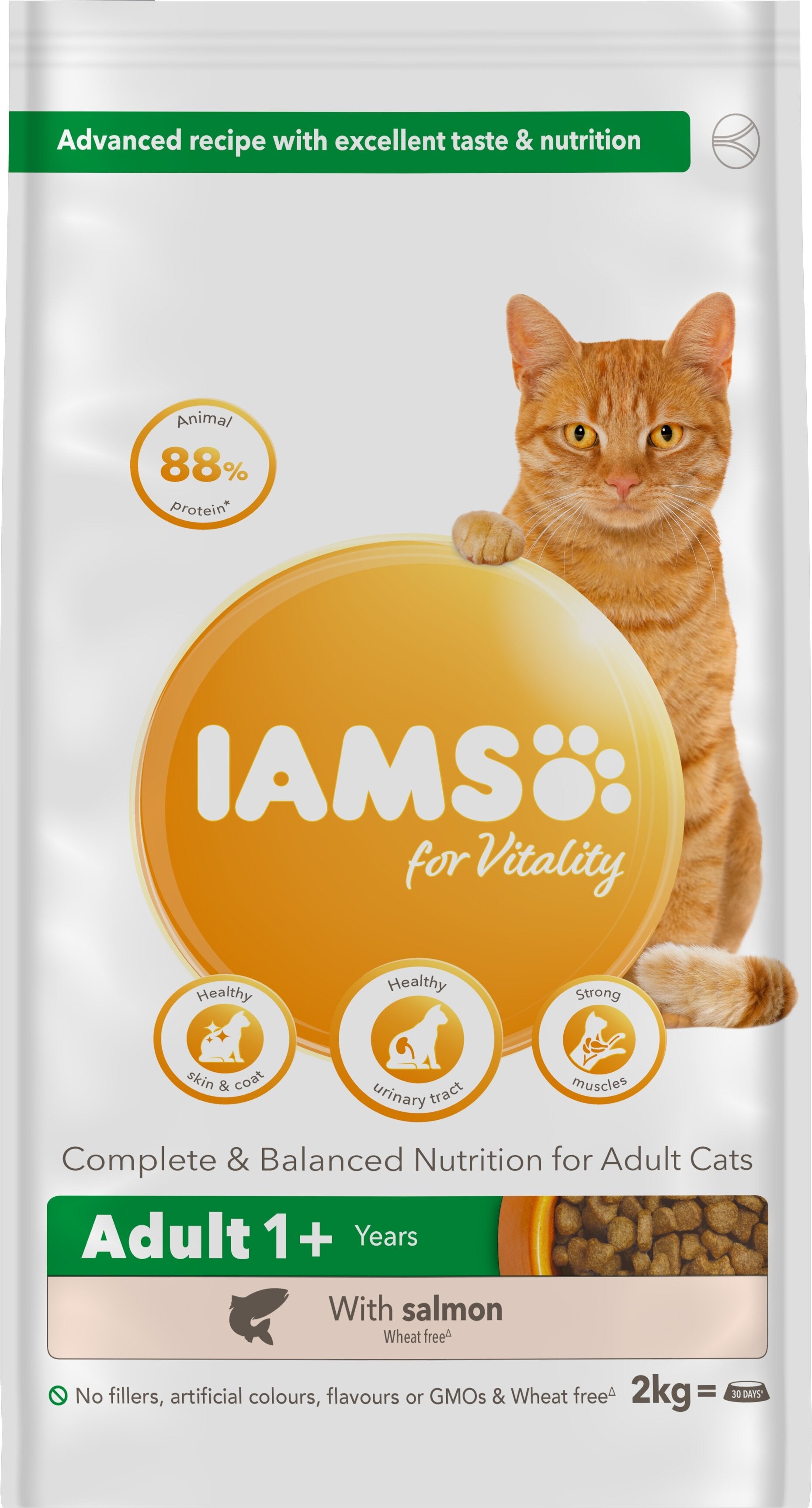 Iams Cat Adult Vitality Salmon dry food for cats from 1 to 6 years. IAMS for Vitality adult cat food with salmon is a 100% complete and balanced expert nutrition to help support your cat’s 7 signs of healthy vitality, so you can admire their shiny coat and healthy skin. All of this packed into a tasty recipe with 88% animal protein (out of total protein) for your pet to enjoy every day.